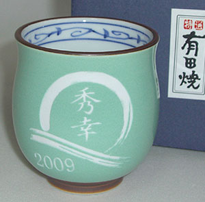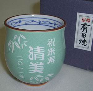 | 還暦祝いにおススメ♪有田焼 湯呑(大・緑) 彩釉兎絵 (彫刻料金込) |