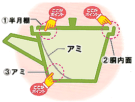 Bのアミで大きなアミと胴体との空間により、茶葉がつまりにくくなっています。また、細かいアミ目(50メッシュ)なので、深むし茶や粉茶もおいしくいただけます。