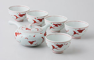 鮮やかな赤色が印象的な作品です☆還暦祝いのプレゼントにおススメ☆日本トップクラスの陶磁器、有田焼の茶器セットです |